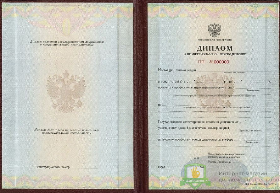 Если вы планируете купить диплом о профессиональной переподготовке 1996 - 2012 год, не сомневайтесь – получаете подлинный документ, который заполняют профессионалы, имеющие многолетний опыт работы в сфере образования. Документ на 100% соответствует всем требованиями Министерства науки Российской Федерации.